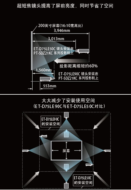 松下全新開發的超短焦鏡頭ET-D75LE90C通過安裝到松下三芯片DLP投影機上,大幅節省了安裝空間。與原有的短焦鏡頭ETD75LE50C相比,可以有效縮短60%的投影距離,從而解決了以往由于空間不足而無法安裝投影機的問題,更有效地利用了三芯片DLP投影機的高亮度、高畫質的優勢。例如: