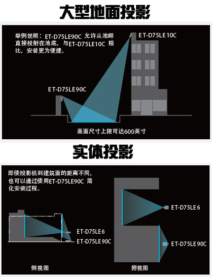 在相鄰建筑物上或較高樓層上安裝投影機。ET-D75LE90C的出現解決了這一系列問題,即使緊鄰地板,同樣可以投影出高清晰的大型畫面,大大簡化了安裝過程。