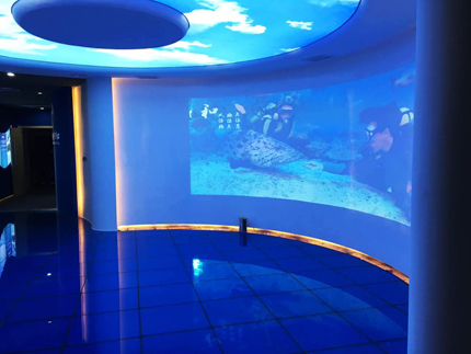走進展廳,一面巨大的弧幕映入眼簾。展廳內(nèi)投影畫面以正投融合的方式成像,全方位展示了海島中心在科技研究方面的豐碩成果。通過2臺6300流明高亮度的PT-FD601CL投影機的畫面顯示,參觀者可以直觀地感受到細膩且震撼的視覺效果。動態(tài)色彩亮度控制技術的強大色彩表現(xiàn)力,在實現(xiàn)了高亮度的同時又提升了色彩還原度,不僅向參觀者充分展現(xiàn)企業(yè)文化,也將未來海島中心的發(fā)展藍圖清晰的呈現(xiàn)于弧幕之上。內(nèi)置強大的多畫面拼接系統(tǒng),完美的實現(xiàn)邊緣融合、色彩匹配及多畫面處理的功能。24小時×7天連續(xù)運行,高效穩(wěn)定,呈現(xiàn)持久亮麗的畫面效果。松下投影機的投影顯示,讓原本深奧的海洋科技揭開了神秘的面紗,變得更加清晰易懂。