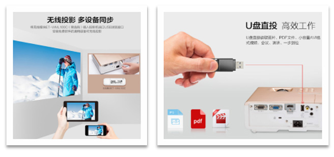 通過無線模塊ET-WML100C(選配件),并下載安裝免費軟件,用戶即可輕松實現(xiàn)筆記本、手機(jī)和平板等設(shè)備便捷的無線投影。除此之外,將存儲有演示文稿、圖片或小容量AVI格式視頻的USB記憶卡插入投影機(jī)端口即可輕松進(jìn)行直接投影,化繁為簡,靈動操作。