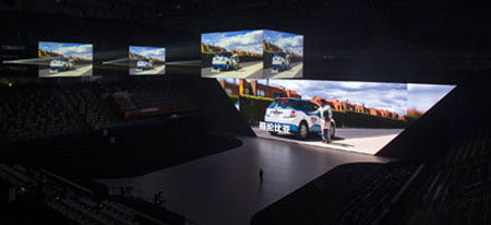 本次比亞迪品牌之夜活動采用10臺30,000流明的PT-SRZ31KC松下激光工程投影機,投射畫面左右橫跨上海東方體育中心,其中7臺單打10.6×6米高空中的7塊大屏幕,單打亮度堪比LED,3臺全部投射地面并進行邊緣融合,呈現超大畫面的震撼效果,為現場觀眾帶來超乎想象的視覺盛宴。