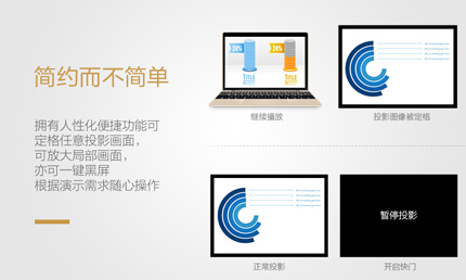 記憶卡瀏覽功能:只需將存儲有演示文稿的USB記憶卡插入投影機端口,直接投影JPEG、BMP、PNG、GIF和TIFF圖像。