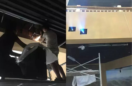 一個(gè)直徑約為6米,高約5米的全鋼架環(huán)形造型,中間有兩個(gè)對稱的通道,環(huán)形的中心是一座直徑約0.5米,高2米的杜甫雕塑。這就需要考慮到:投影機(jī)的安裝位置、中間雕塑是否擋光、投影光會(huì)不會(huì)照射到人眼、紗幕安裝、音響安裝等一系列問題。最后,技術(shù)人員通過在模型鋼架上焊接方鋼,然后將投影機(jī)吊架焊接在方鋼上的方式將投影機(jī)吊裝。造型上沿有一個(gè)約25公分的槽,投影機(jī)安裝好后尾部距離墻面還有15公分的空隙。紗幕的不銹鋼導(dǎo)軌就安裝在空隙內(nèi),同時(shí)音響也裝在槽內(nèi)并用紗幕遮擋。