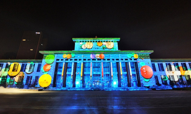 燈光秀通過32臺20000流明松下PT-SDZ21K2C三芯片DLP工程投影將內容投射在展館南墻上... >>