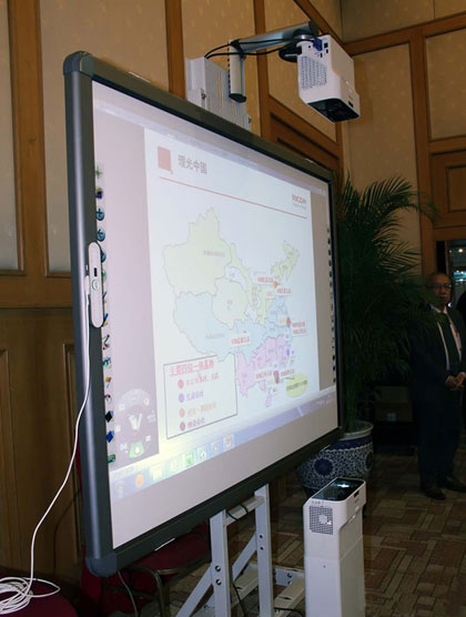 超短焦投影機的出現(xiàn),其最初的應用就是在互動教學方面,配合交互電子白板,為教育單位提供全新的互動教學演示方案。理光直立投影在互動教學方案中,安裝更加方便。