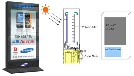 這種工程設計強調其整體的工藝結構,保證了室外機柜對顯示器有足夠的保護強度;并能夠抵抗沙塵、風雨酸堿的侵蝕;此外,還增加工業(yè)溫濕度傳感裝置,配合內置空調壓縮機,使產品適用于中國的特殊環(huán)境:無論零下30度的北方冬季,還是零上60度的南方酷暑,室外機都將在檢測到環(huán)境溫濕度后,首先判斷是否啟動空調系統(tǒng),然后才會延時打開液晶顯示器,有效保護顯示屏不受任何環(huán)境影響。