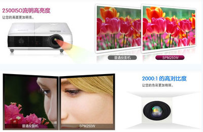 作為一款家用投影機,色彩表現的優劣直接決定了用戶的視覺體驗度,正因為如此,三星M250W采用了色彩還原能力更為出色,色彩飽和度更高的3LCD投影技術,非常適合用戶觀看影片、視頻,游戲等為主的家庭娛樂應用。三星M250W的亮度接近商教投影機級別,達到了2500流明--較高的亮度擺脫了環境光線對使用的束縛,即使您在白天觀看影片,也絲毫不必擔心因為環境光較亮,會導致投影畫面的清晰度受到影響。M250W的標準分辨率達到了WXGA水平(1280×800像素),對比度為2000:1,可以保證為您呈現精細畫面的同時,更能為您帶來層次分明,絢麗奪目的色彩。