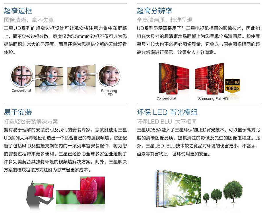 | 用三星LFD來(lái)創(chuàng)建您所期待的終極視頻墻吧。三星LFD大屏幕顯示器內(nèi)置了一個(gè)硬件解碼的視頻矩陣處理器,在它的幫助下你可以完成從1×1到10×10之間的任意數(shù)量視頻墻拼接。而更棒的是,如此強(qiáng)大的功能應(yīng)用您卻無(wú)需為其支付任何額外費(fèi)用。 |