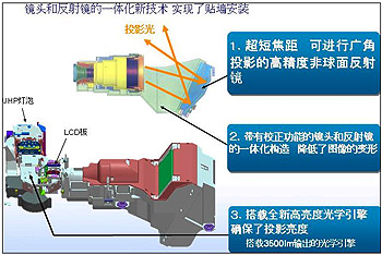 三洋公司新開發的投影鏡頭,實現了鏡頭和反射鏡的一體化,實現了貼墻安裝。