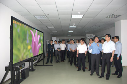 2015年10月10日,視美樂迎來了市委書記、市人大常委會主任王中蘇先生帶領(lǐng)的四套班子成員、相關(guān)鎮(zhèn)政府領(lǐng)導(dǎo)一行60余人的參觀隊伍。王書記一行對與視美樂呼應(yīng)國家“中國制造2025”的發(fā)展戰(zhàn)略表示高度認(rèn)可,對視美樂二代產(chǎn)品上市情況表示將持續(xù)關(guān)注。