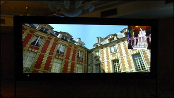 1×2背投融合系統由1塊高2.2米、寬6.16米(不算邊框)的背投融合投影幕、兩臺夏普三芯片DLP投影機XG-P560WA(亮度6000流明、分辨率1280×800、鏡頭1.8-2.25:1)1臺兩通道ProMedia(華彩霓視)融合處理器組成。
