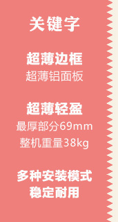 LED邊緣背光實現(xiàn)低功耗,更節(jié)能,也使得機身更加輕薄時尚,最厚處只有36mm,可適應(yīng)各種安裝環(huán)境。 |