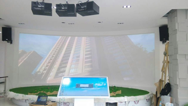 -DSX700工程投影機(采用A02鏡頭):其中3臺SNP-DSX700工程投影機,通過吊裝正投融合輕松實現弧形7.2米*2.5米的超大投影畫面;另外2臺則在吊頂內隱藏安裝,通過融合,投射到地面面積為3米*1.5米的沙盤上。5臺索諾克Sonnoc