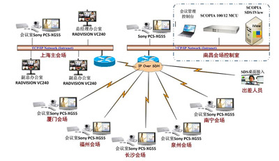 此套系統是架構在INTERNET網絡,以南昌公司作為視頻會議的核心節點,放置一臺RADVISION高清MCU,其他分公司作為分支節點,采用索尼高清視頻會議終端PCS-XG55。
