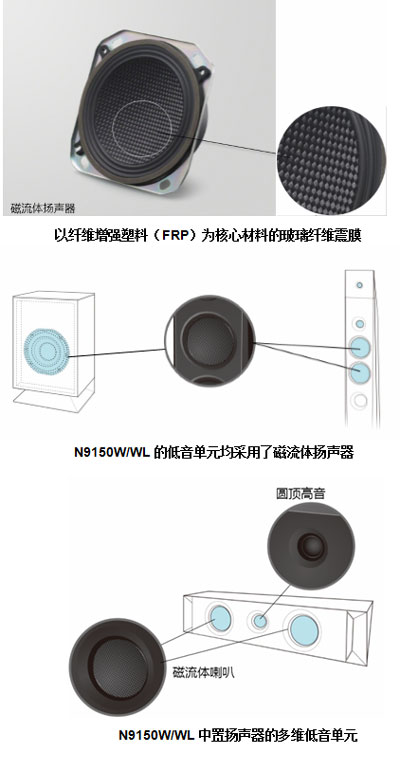 此次推出的旗艦型號N9150W/WL在揚聲器設計上采用了磁流體*揚聲器和玻璃纖維震膜等全新要素,并對整體音頻單元結構做出了全面提升,力圖令消費者獲得更為震撼的聽覺享受。