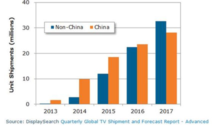 NPD DisplaySearch數據印證了這個事實:4K電視2013年在中國的出貨量占據全球出貨量的87%。這意味著中國在全球4K電視的出貨量中占絕對領導地位,對4K廠商有決定性的意義。