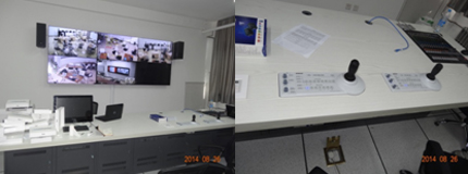 504室按照精品課程錄播系統標準建設,能進行精品課程的錄播。教室內前后安裝兩個投影幕,教室的一側安裝兩臺教學觸控顯示屏,教室的頂部吊裝三臺帶有可調節支架的索尼BRC-Z330攝像機。中間位置的攝像機主要拍攝兩臺顯示屏以及學生;兩邊的攝像機主要拍攝授課的老師。另外為了方便教師的授課時的路徑變化,還在顯示屏的上方預留一個機位,這樣就能夠在觀摩室中更全面的看到該教室的圖像。