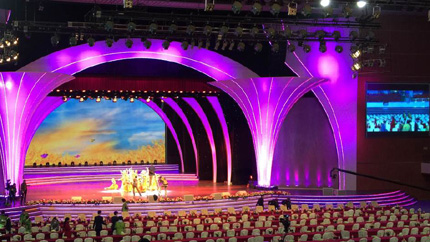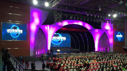 會場共有三塊LED顯示屏,其中中間一塊大屏幕作為主屏,兩側(cè)各有一塊較小的LED作為副屏。VP