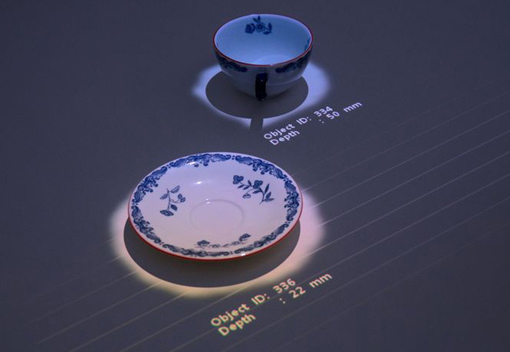 這個“互動型桌面”的產品,相較以往的方案感覺更加靈活快速,質感非常好。其采用深度傳感器和運動跟蹤設備,能夠獲知物體放在桌上,甚至標注書籍的內容,與互動桌類似的應用場景,但是設備更為小型化,同時視覺也更好。