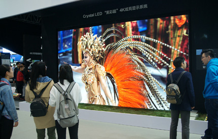 大尺寸畫面引人矚目。它寬4.8米高2.7米,采用索尼自主研發的精細LED技術,發光單元尺寸僅為0.003平方毫米,顯示單元99%面積采用黑色光學處理,對比度高達1,000,000:1。亮度達到1000nit,顯示單元之間可實現“無縫拼接”,水平/垂直都有接近180°廣視角,在各角度觀看色彩和亮度都不會發生改變。現場人們紛紛在Crystal