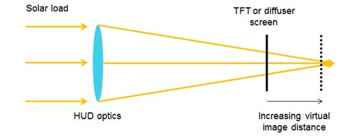 為了延長虛擬圖像的距離,設計放大倍數為25到30倍的系統已屢見不鮮,但這樣的設計弊端是太陽能負載(即太陽能)集中于HUD成像儀面板上極小塊區域時會產生過大負荷熱量。這種高倍數放大會將成像儀面板移向距離HUD光學器件焦點更近的地方,從而提高單位面積太陽能的集中度,如圖所示。