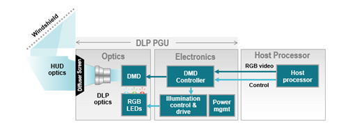 利用DLP®技術獨特的中間散射屏結構,可以設計出能夠承受由太陽光放大所產生熱負荷的HUD。如圖3所示,基于DLP技術的HUD可以將圖像投射到散射屏上,然后HUD光學器件將其放大并投射到擋風玻璃上,從而呈現在駕駛員的視線中。在TFT