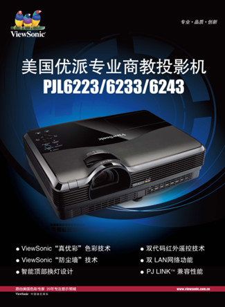 針對這一問題,作為少數幾家同時推出DLP和LCD兩種投影技術產品線的廠商,美國優派(ViewSonic)又顯示出其在商教投影領域的強大研發實力。針對商教用戶差異化的應用特點,推出的PJL6系列投影機,更是以三款產品PJL6223、6233、6243的五大優勢,滿足了現代商務和教育用戶的投影演示需求。