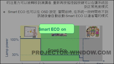 ECO功能,更讓商教用戶可以借助遙控器實現投影畫面的明暗調節,使聽眾的注意力可以更好地轉移到演講或者教學者身上,以打造極佳簡報教學效果。這對于大約只有23%的時間需要使用投影畫面的商教用戶來說,利用控制燈泡輸出功率來達到最大節能效益的Smart