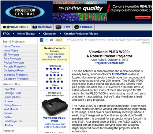 W200的評測文章中 ,不僅以“一個強大的掌上型投影機”為標題,作者Allan