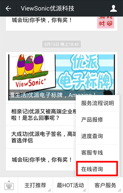 優派服務大升級的第二重驚喜就是優派微信在線客服上線啦!KFMM每天8:00-23:00在線靜候各位優粉,親們有任何關于優派產品的售前、售后問題都盡快的拋給優派吧,KFMM會竭誠為各位優粉們服務,年中無休哦!