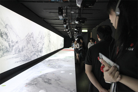 由D5000投射出的全長(zhǎng)36.8米、高1.8米的大型互動(dòng)山水黃公望的《富春山居圖》,向參觀者展示了恢弘的歷史畫(huà)卷,不僅可以享受巨幅的富春山居圖外,還可與山居圖做人畫(huà)互動(dòng)。Vivitek麗訊創(chuàng)新性地使用高端工程機(jī)才具備的主動(dòng)式拼接技術(shù),讓用戶能夠以更低的成本投入,享受到更快的融接速度和理想的畫(huà)面效果。
