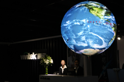 球幕投影能做什么?可以讓您置身于宇宙中,您相信嗎?在展出現場,展廳的正中央就是球幕投影技術案例展示的區域。4臺D6520高端工程投影無縫隙投射,將一個完整的地球完美的展示了出來。這樣一個球幕投影方案,栩栩如生的將一個虛擬的地球投射出來,在D6520強大性能的幫助下,地球上的海水、陸地、云彩均活靈活現的出現在大家的面前,更為難得的是,如果您觀察仔細,就會發現這個地球還在有規律的自轉,并且連陰陽的切換都是那樣自然、柔美。工作人員介紹,球幕投影方案適應于天文館、天象廳、科技館、博物館、科普館等有球面現實的專業用戶,可以通過虛擬影像給大家帶來身臨其境的視覺體驗,是傳播知識、介紹企業創意的絕佳應用方案,利用極具穿透性、逼真的效果讓體驗著沉浸其中。而為此次球幕投影方案保駕護航的D6520屬于雙燈工程投影,全金屬架構,十分安全穩定,而且操作簡便,擁有1600×1200的全高清分辨率,而且具備3000∶1的超高對比度、亮度也達到了6600流明。無論博物館、科技館等展覽現場,還是300人的大型媒體演示廳,或是戶外開放廣場的大型演出演示,Vivitek麗訊全高清工程機D6520都能隨心所欲支持各項新技術,投射出震撼清晰的高質畫面,讓現場通透明亮,畫面生動逼真,觀賞性極佳。