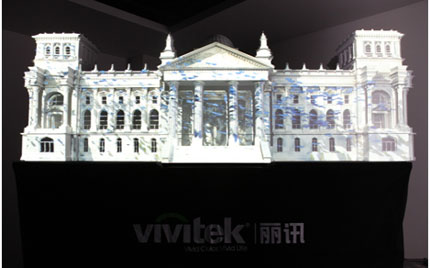 在活動中,首先受到大家關注的優秀應用案例,便是一場精彩的外墻投影秀。兩臺高端工程機D8800齊發力,將炫彩奪目的精彩影像,完美的投射在原本色彩單一、構造簡單的模型上。白色的模型上,上演著不同尋常的畫面,時而魚兒在大廈中穿梭,時而建筑崩塌破損,時而又片片重新組合。一個簡單的建筑模型,在兩臺D8800通過外墻投影的粉飾后,成為變化莫測的投影幕布。Vivitek麗訊工作人員介紹,這種出色的表現得益于D8800杰出的性能。這款業界性能最強的雙燈工程投影,采用了德州儀器DLP™