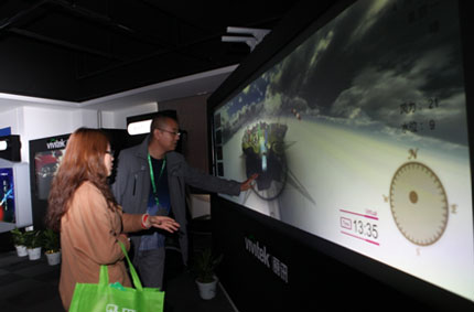 這么一套數據可視化系統就出現在大家的面前。展出現場,工作人員利用這個系統,模擬了城市用電的實時監控,與會人員可以直觀的看到目前的用電總量、家庭與工業用電分布等一系列的數據,共專業人士分析。同時,用戶還可以與機器進行互動,簡單的點觸和手臂揮動就可以對屏幕畫面進行操作,調取數據等。據悉,這樣的系統是為企業經營、供水供電單位、交通部門以及分析機構量身定做的,直觀的互動模板可顯示各種數據、流量,讓這些專業用戶輕松分析,決策,而可人機互動的操作方式,更讓工作便捷簡單。如果應用于教育領域,還能增加學生與老師的互動,增加課堂的趣味性,讓學生對課堂產生興趣。工作人員介紹,構架這個數據可視化系統的兩臺投影機也并非普通的傳統投影,而是支持1080P的純激光超短焦投影機,這兩臺投影采用了背投的方式,在緊貼幕布的情況下,投射出了全高清的畫面,而激光光源更是為投影機增添了穩定性和可靠性,讓機器面與維修。