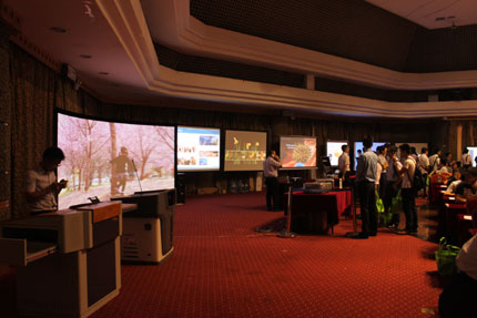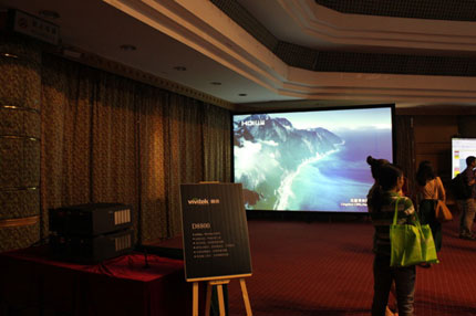 在會場側面,2臺D8800進行的雙機拼接方案,呈現給渠道伙伴的是具備全高清分辨率的200英寸巨幅畫面,高亮度、高畫質的完美結合,令參會者印象深刻,與D8800遙相呼應的是D6515以正投的方式,投射出了水平60度、將近5米寬、2米高的大型弧幕畫面,再加上會議最引人注意的4臺D8900疊加、拼接融合方案,這三款投影方案以不同的應用方式,展現了Vivitek麗訊工程機在應對不同投影環境時的多變性和大場面展現氣勢磅礴的杰出的投影效果。