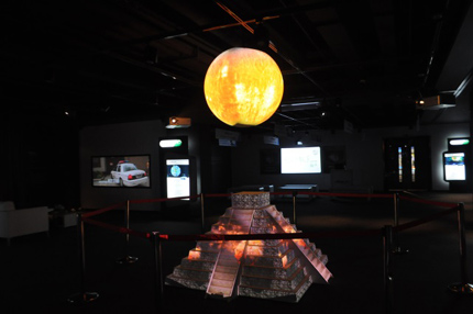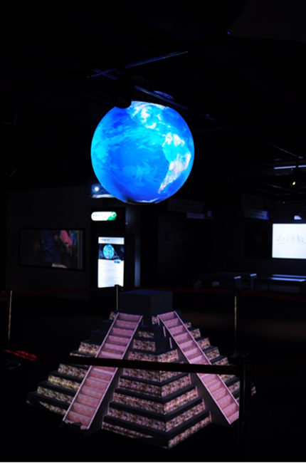 一個藍色的地球在空中旋轉,與下面一個拜天臺遙相呼應。突然,地球變成了一個超大的火球,拜天臺瞬間火光一片,這一生動的畫面,不是哪部電影中的場景,而是展廳內外球幕投影和外墻投影結合方案帶來的演示。
