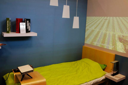 從客廳移步到臥室,QUMI系列微投產(chǎn)品出現(xiàn)在眼前。在模擬的臥室環(huán)境內(nèi),一臺(tái)QUMI