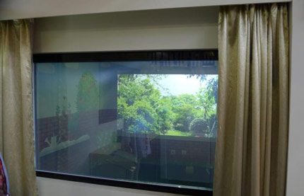 1臺(tái)Vivitek麗訊工程投影DW6030在模擬客廳落地窗前以背投方式,投出戶(hù)外的漂亮景色,讓主人足不出戶(hù)就能欣賞世界各地的漂亮風(fēng)景,并可隨時(shí)調(diào)控,愉悅心情。