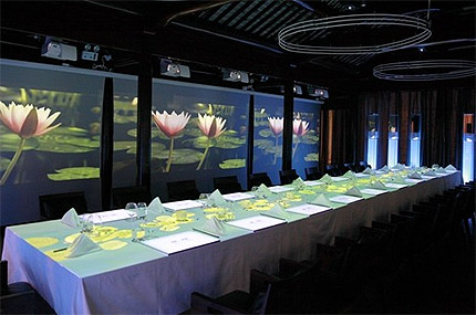 D5185HD投影機搭配短焦鏡頭,通過機身自帶的鏡頭位移功能,可將機器隱身于天花結(jié)構(gòu)的正中,在2.5米的距離內(nèi)實現(xiàn)長8.4米,寬1.2米的融接畫面,同時搭配紅外線CCD裝置,實現(xiàn)賓客與投影的互動。 |