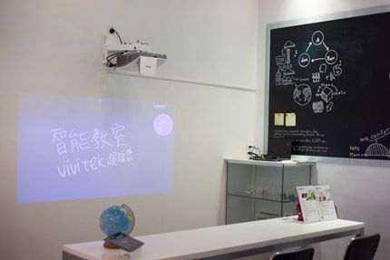 Vivitek(麗訊)所在的智能生活館以意像化智能之樹(shù)勾勒出科技串聯(lián)生活的主題,展現(xiàn)出臺(tái)灣智能生活產(chǎn)業(yè)開(kāi)啟的幸福一天。在智能生活館的教室區(qū)域內(nèi),Vivitek(麗訊)展示了一套全新的教學(xué)協(xié)作系統(tǒng),該系統(tǒng)是一款支持筆記本電腦、平板等多平臺(tái)混合使用的高分辨率無(wú)線(xiàn)投影協(xié)作系統(tǒng),主要由Vivitek(麗訊)超短焦互動(dòng)投影機(jī)和無(wú)線(xiàn)投影互動(dòng)協(xié)作系統(tǒng)兩部分組成。