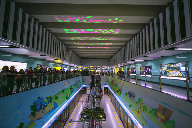 從11月18日第六屆廣州國際燈光節開幕當天開始,廣州地鐵APM線廣州塔站每晚變身“音樂廳”,乘客可以在地鐵站內彈奏鋼琴,伴隨音樂旋律不斷變化,8臺亮度為10000流明的Vivitek(麗訊)工程投影機將震撼的動態畫面投射到天花板上,投影技術與特效幻影相結合,營造出奇幻動感的投影效果,游客抬頭仰望便如同置身其中,周圍的七彩燈光隨音樂節拍呈現出炫彩天幕,為游客增添強烈的視覺與聽覺雙重震撼體驗。