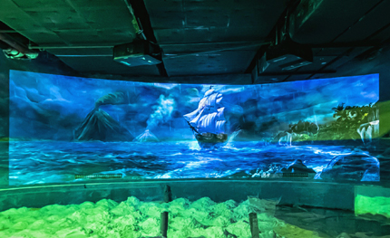 除了“亞特蘭蒂斯”展區,Vivitek(麗訊)還在廣州正佳極地海洋世界打造了“水母表演區”,運用6臺D8800投射出長13米、高3米的弧形沉浸式巨幕,數千只形態各異的水母簇擁成群,呈現美輪美奐的幻彩水母舞蹈秀;在5D影院展區,4臺亮度為11500流明的Vivitek(麗訊)DU9000工程投影機通過被動式融合的方式打造出長7米、高2.2米的5D巨幕,置身于5D影院,游客可以從0海拔“深潛”至10萬米深的海底世界,并在途中與不同海拔的海洋生物不期而遇,將視覺、聽覺、嗅覺、觸覺和動感完美地融為一體;而在“加勒比海觸摸池”展區,2臺Vivitek(麗訊)DU6675工程機打造出長6米、高2.2米的加勒比海,惟妙惟肖,游客仿佛化身“杰克船長”,在加勒比海上乘風破浪,經歷著各種神奇的海上冒險。