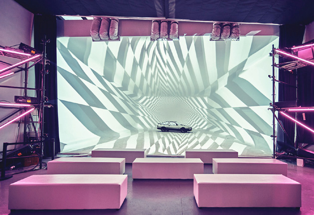 AE86在靜止時,時而在黑白交替的空間中穿梭,時而在螺旋狀旋轉的粒子空間中馳騁,時而又在浩瀚的宇宙空間中漂移,光影與空間不斷變化,將觀眾帶入一場奇幻的視覺之旅。更奇妙的是,隨著AE86車體的運動,投影融合拼接的整個影像絲毫不會被破壞,震撼的3D影像隨音樂的節奏而變化,如此美妙的互動基于工程投影業界的領先技術,就是被投影物體運動的實時融合運算。