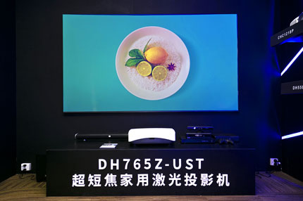 此外,另一款剛上市的超短焦激光全高清家用投影機DH765Z-UST也受到了現場觀眾的廣泛關注,它采用使用壽命長達20000小時以上的激光光源,擁有0.233:1超短焦投射比,54厘米的距離即可投射出100寸超大畫面,放置于電視柜上即可使用,為空間有限的家庭用戶提供了理想選擇。性能方面,DH765Z-UST擁有4000流明亮度、30000:1高對比度、支持1080P原始分辨率和全格式3D,符合Rec.709色域標準,提供逼真的色彩還原,在客廳中便可輕易實現震撼的影院級效果,2.35:1縱橫比畫面比例更是打造出原汁原味的好萊塢大片視覺效果。