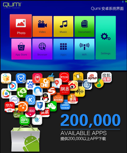 Vivitek(麗訊)微投QUMI Q3 Plus成為QUMI家族首次搭載安卓系統的型號,全新的多媒體界面操作更加流暢,內置8GB存儲容量,用戶可以根據需求下載豐富的應用軟件,將“電視盒子”、“隨身影院”、“商務辦公”等功能集合在Q3