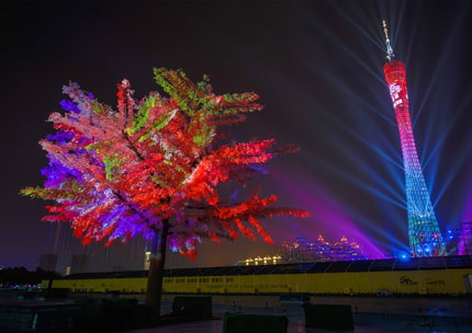 本屆廣州國際燈光節,Vivitek(麗訊)參與展示的最新作品融入激光光源、3D投影等最新科技元素,共計20臺Vivitek(麗訊)工程投影機將在18天主展期內持續穩定工作,協助創作人員打造炫麗、奇幻的光影魅力空間。其中,Vivitek(麗訊)在主會場花城匯打造4號作品《光之樹》,由法國多學科藝術設計團隊Danny