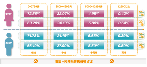 京東大數據分析了網購用戶選擇的投影機價格區段,2016年中端產品占比有所提升,并且女性網購者選擇的中高端和高端產品占比都有大幅度提高