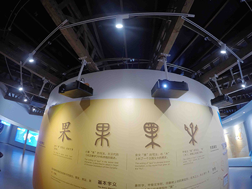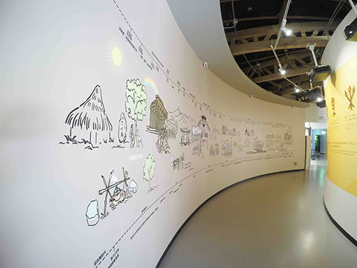走進樂果展廊,游客們即被“果樹栽培歷史互動墻”吸引。弧形墻面上繪制簡約風趣的圖案,仔細一瞧原來是人類栽種果樹的歷史重大事件。當游人走近輕撫畫面,驚喜出現,墻上的圖畫一下子變得五彩斑斕,動態效果讓人眼前一亮,絢麗的彩虹、噴氣的煙囪、還有科研創新的靈感閃光,
