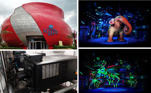 同樣是在光影奇境體驗區的“4D夢工廠”動感特效影廳,采用2臺NEC