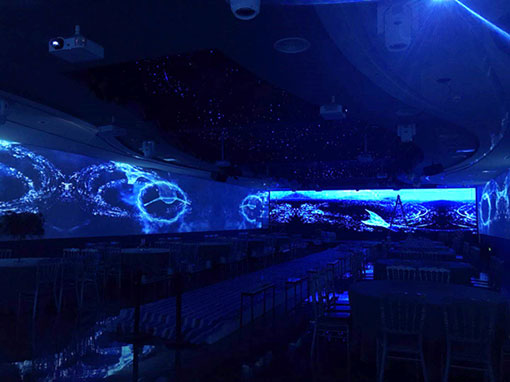 漫天繁星都是愛的見證,星辰環抱惟愿許你一世瀲滟柔光。伴著皇家藍由淺漸深,片刻后絢爛耀眼又如極光。顯然,液晶投影機更擅長于表現豐富的色彩和層次,但要實現270°大視角畫面且色彩無差異,需要克服色彩一致性的困難。CF6600U液晶投影機可以對色溫進行自定義,使多臺融合操作下的色彩趨于一致,再配合上劇院級燈光音響系統,能讓賓客感受到璀璨光影與現實并存的錯綜掩映。